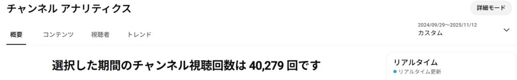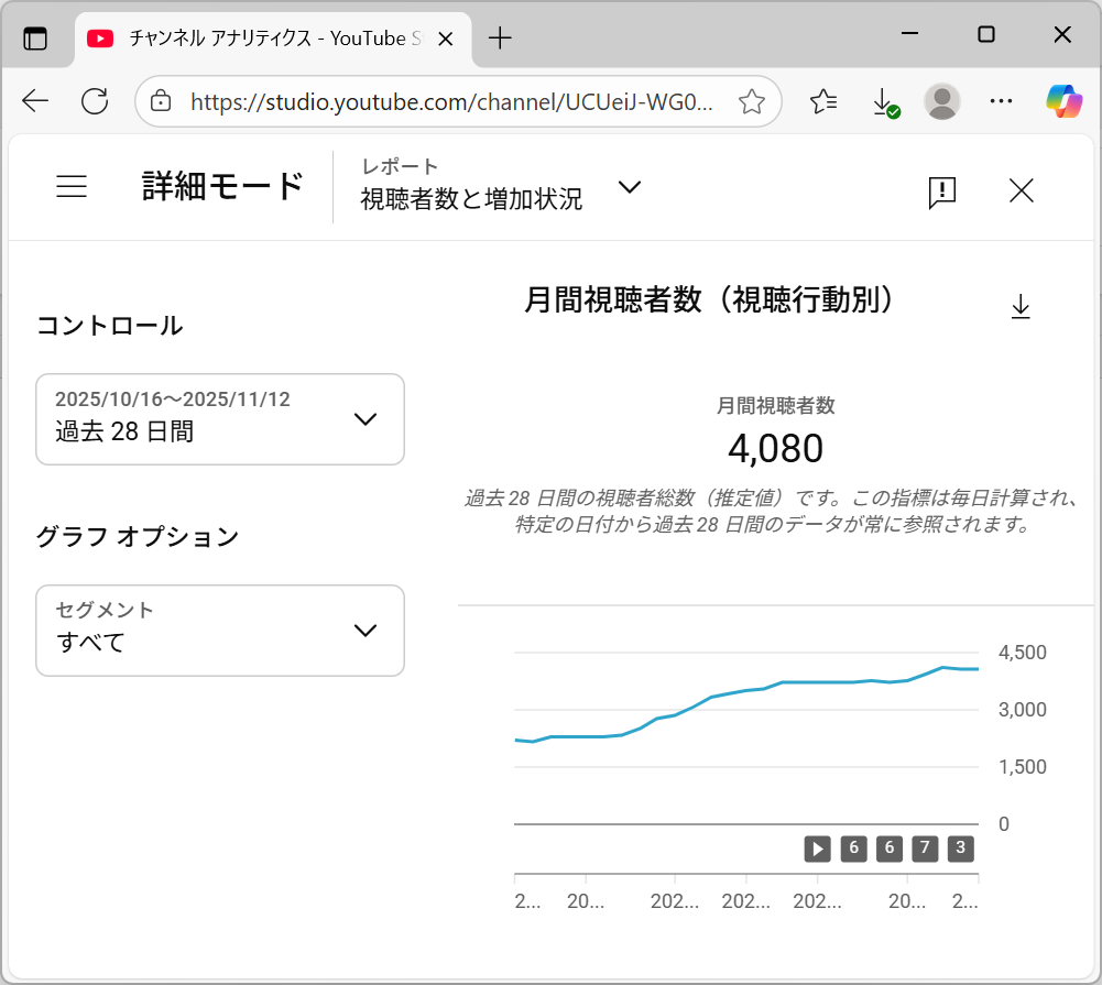 更には、直近(過去28日間:10/16-11/12)の月間視聴者数が4,080人とのことで、4,000人の大台を突破しました。(視聴回数ではありません!!)。月間視聴者数データは毎日更新されます。